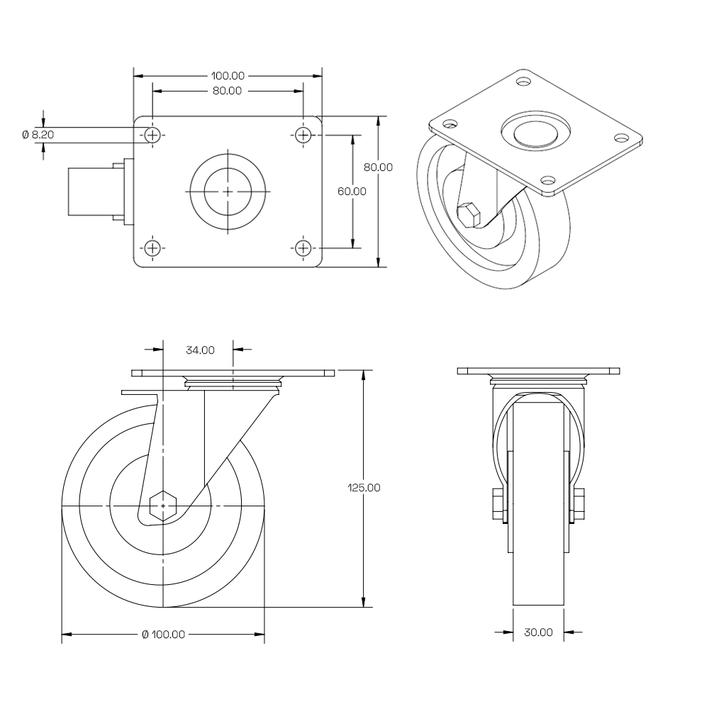Swivel castor with top plate, stainless steel clevis and blue PU tyre. Suitable for intensive use. 100mm, 180kg.