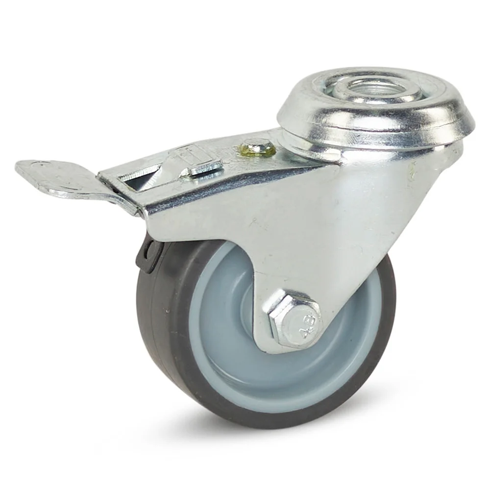 This swivel castor with brake has a central hole, making it easy to secure this wheel with 1 bolt or expander.