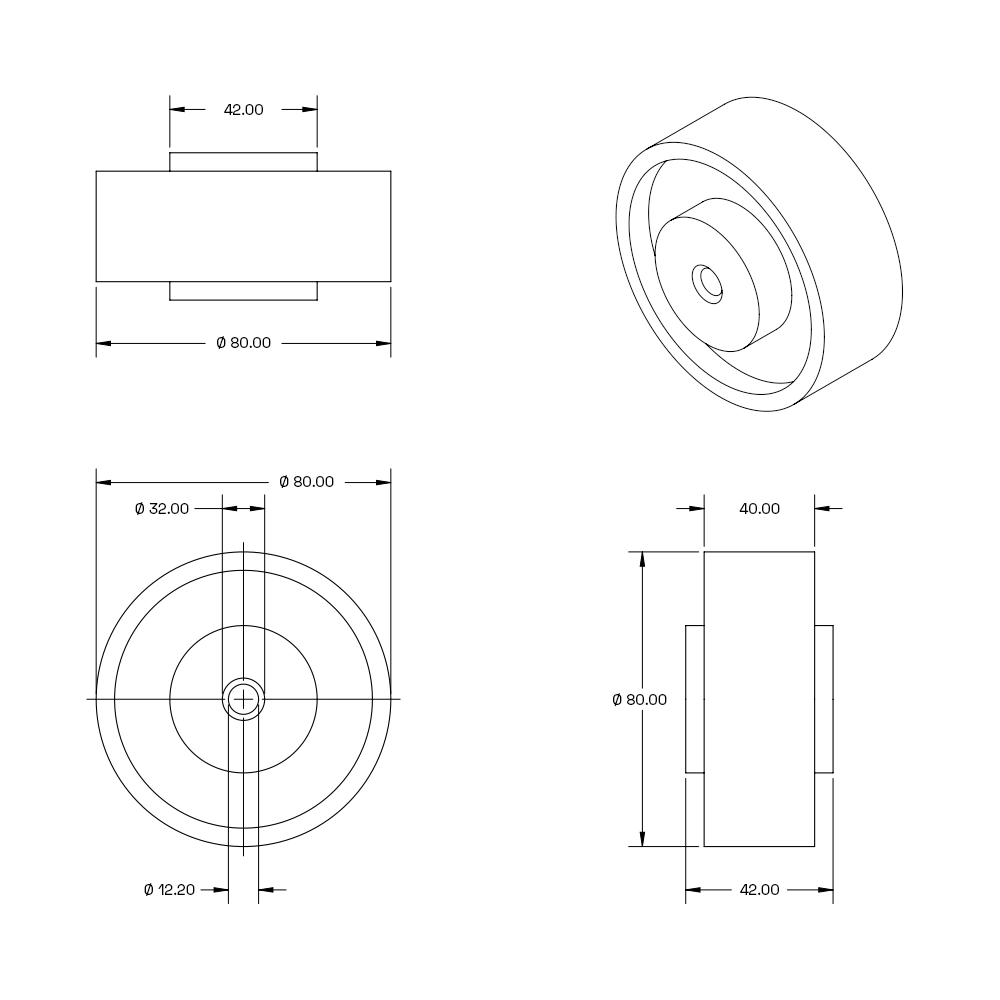 PU heavy duty wheels - 80 mm - 300 kg, these are loose heavy duty wheels with a diameter of 80 mm and a load capacity of 300 kg per wheel. The tyre is made of PU (Polyurethane) and the wheel body of Aluminium.