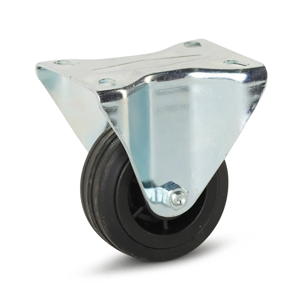 This rubber fixed castor has a top plate, with which the wheel can easily be fixed with 4 bolts. Fixed castors are best used in combination with 2 swivel castors or 2 braked swivel castors, because fixed castors can only drive in one direction.