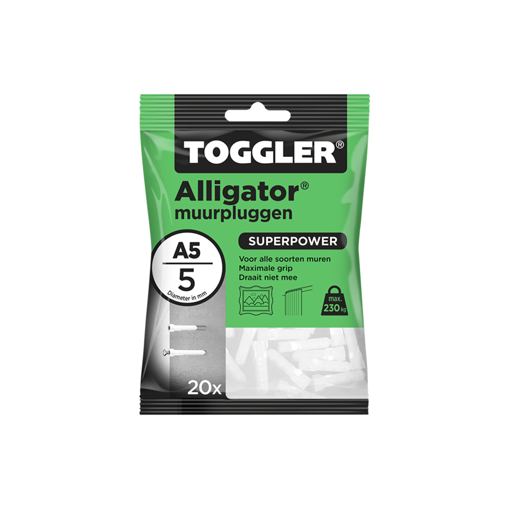 Toggler Alligator Plugs - 5mm (20 pieces) is a pack of 20 alligator plugs. These plugs are 5mm in size and are designed for secure fixing in various materials. The product is known for its strength and reliability, suitable for various DIY or professional projects indoors and outdoors. The alligator plugs are versatile and can support significant weights, making them ideal for installations that require durable and strong fastening solutions. With Toggler's reputation for high-quality fastening solutions, this product ensures efficient and long-lasting performance.