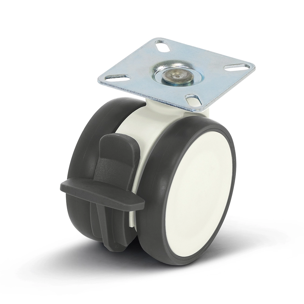This white double furniture braked swivel castor with top plate has a diameter of 75 mm and a load capacity of 80 kg. The tyre is made of thermoplastic rubber and the wheel body of polypropylene.