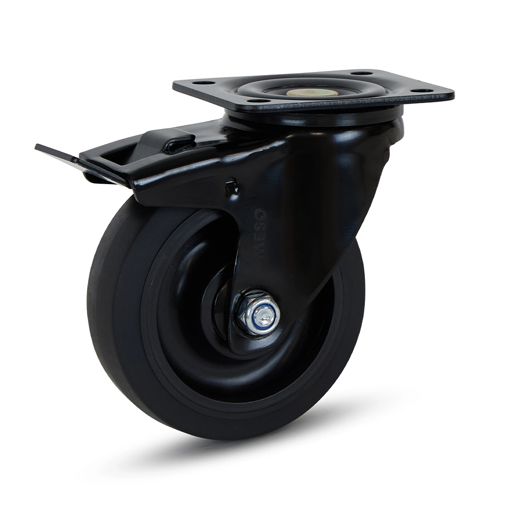 Black rubber swivel castor braked with top plate - 125mm - 250kg